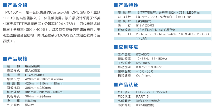 TPC1561Hii,是一套以先進(jìn)的Cortex-A8 CPU為核心(主頻1GHz)的高性能嵌入式一體化觸摸屏。該產(chǎn)品設(shè)計(jì)采用了15英寸高亮度TFT液晶顯示屏(分辨率1024×768),四線電阻式觸摸屏(分辨率4096×4096),以及具有良好的電磁屏蔽性,美觀堅(jiān)固的鋁合金結(jié)構(gòu)。同時(shí)還預(yù)裝了MCGS嵌入式組態(tài)軟件(運(yùn)行版),具備強(qiáng)大的圖像顯示和數(shù)據(jù)處理功能。