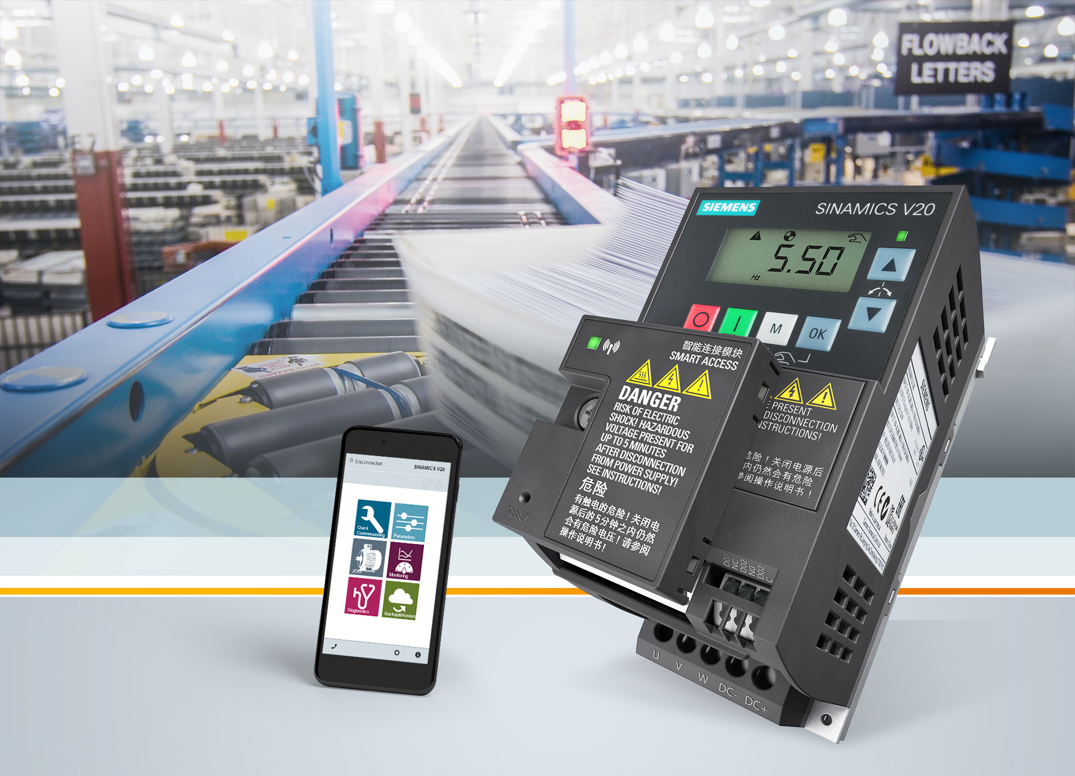 西門子Sinamics V20系列變頻器新增了一款無線調(diào)試和運(yùn)行選件。作為一個(gè)網(wǎng)頁服務(wù)器模塊,“Sinamics V20 Smart Access智能連接模塊”是一個(gè)小型移動(dòng)接入裝置,它可安裝在變頻器上,成為一個(gè)接入點(diǎn)。用戶可以使用手機(jī)、平板電腦、便攜電腦或其他移動(dòng)設(shè)備,通過加密的WIFI連接,訪問V20變頻器,進(jìn)行快速調(diào)試、參數(shù)設(shè)置或監(jiān)控。這樣,即使其安裝在難以接近的位置,用戶都可以隨時(shí)利用熟悉的工具方便地連接變頻器。該模塊具備直觀易用的用戶界面,可通過調(diào)試向?qū)нM(jìn)行快速便捷的調(diào)試。Sinamics V20變頻器是目前市場上最小的變頻器,適用于紡織、包裝、食品與飲料、物流、暖通空調(diào)等行業(yè)。